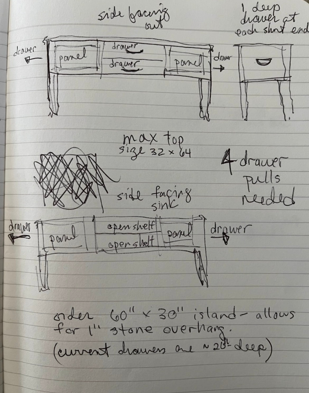 One deep drawer at each end. Two drawers in middle third on one side with shallower open shelves opposite them. Black walnut like in Etsy pics. Prepared to accommodate stone top. Pay half on invoice receipt and other half when finished.